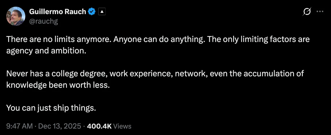 This week’s issue of Josh Brake settles the debate: what the post is saying is that if you approach college with a transactional mindset, sure—but this tweet from Guillermo (whom I respect a lot professionally) misses something fundamental: students are shaped by their college experience in many ways (deep questions, discerning their place in the world, building skills…). Not only that, if anyone can do anything, that’s precisely why college is more valuable than ever: college doesn’t just teach you the what and the how—it’s about figuring out the why. And let’s be honest, while the barrier to building a web app on Vercel has gone to zero, let’s not pretend that the most challenging problems in the world can or will be solved with web apps.